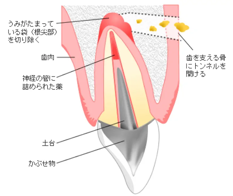歯を支える骨にトンネルを開け、そこから感染部を取り除く術式になるため、被せ物を外さずに治療を行えることもメリットです。